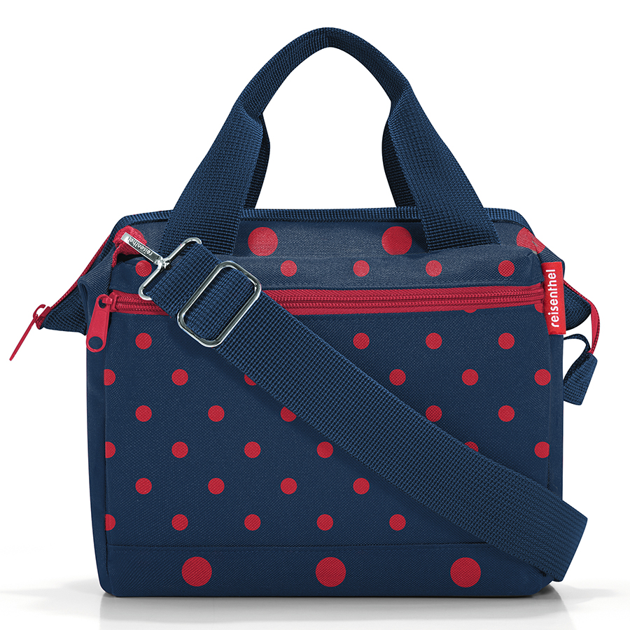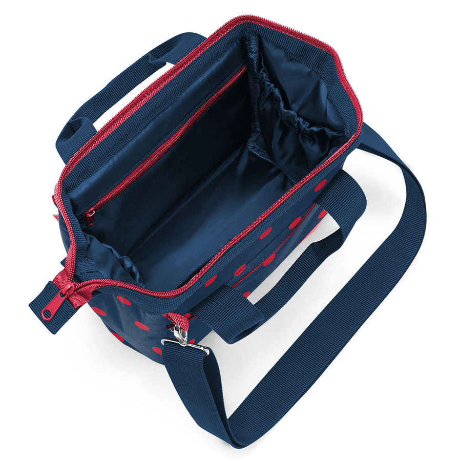 Сумка застегивается на молнию, внутрь встроены металлические скобы, фиксирующие её в открытом состоянии. Внутри расположены 3 кармашка для организации вещей, один из которых закрывается на молнию. Снаружи – 2 удобных кармана на молнии. Две удобные ручки и ремень регулируемой длины позволяют носить сумку так, как вам удобно. Материал – прочный полиэстер с водоотталкивающим эффектом. Объем – 4 л.