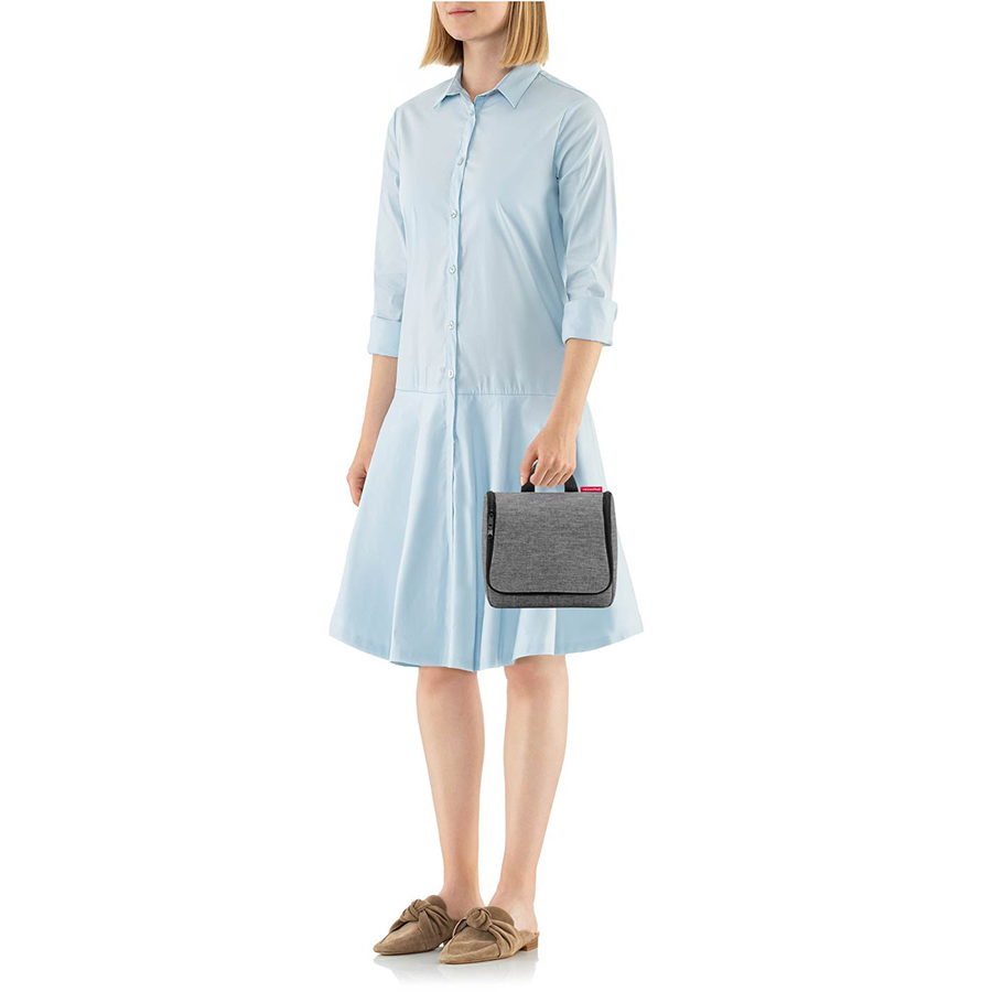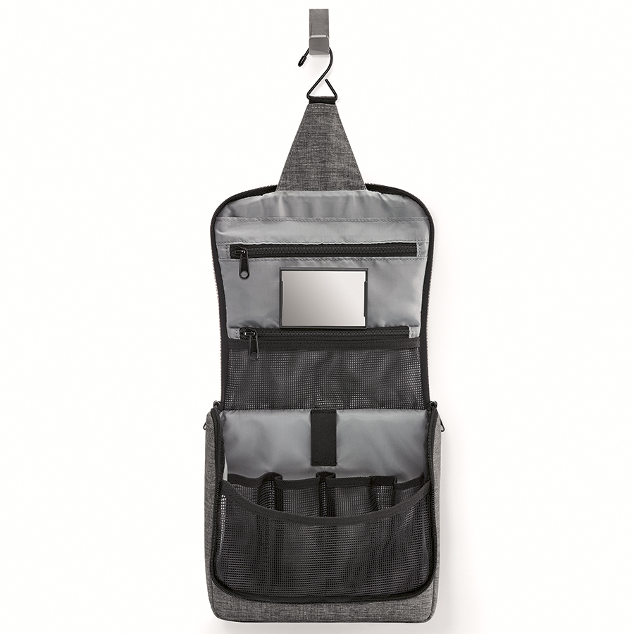 Внутри сумки 1 основное отделение и 4 кармана. На крышке с внутренней стороны 2 кармана на молнии. Также можно прикрепить зеркало на липучку или снять его. Специальный крючок позволяет подвесить сумку в ванной и облегчить доступ к косметике и аксессуарам. Материал – прочный водоотталкивающий полиэстер, выполненный из переработанных пластиковых бутылок. Объем – 3 л.