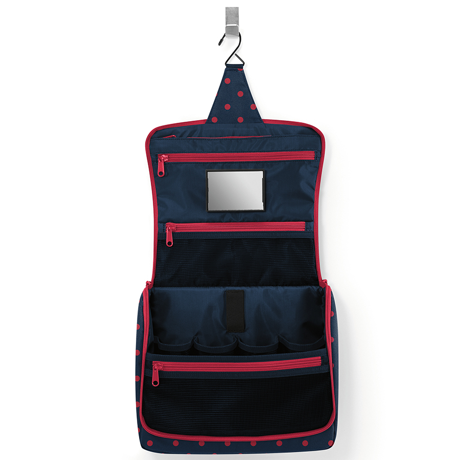 Внутри сумки 1 основное отделение и 4 кармана. Дополнительный карман на молнии в передней части. На крышке с внутренней стороны 3 кармана на молнии. Так же можно прикрепить зеркало на липучку или снять его. Специальный крючок позволяет подвесить ее в ванной и облегчить доступ к косметике и аксессуарам. Размер в сложенном состоянии: 25 х 28 х 10 см. В разложенном: 59 х 28 х 9 см. Объем - 4 литра.