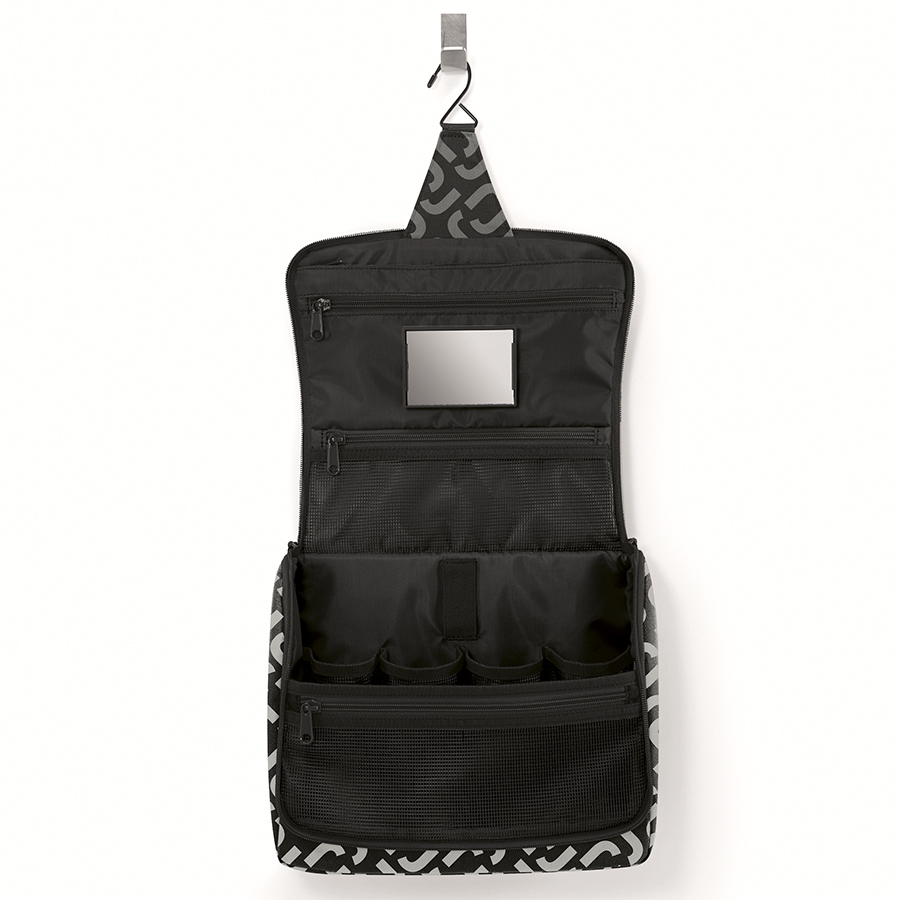 Внутри сумки 1 основное отделение и 4 кармана. Дополнительный карман на молнии в передней части. На крышке с внутренней стороны 3 кармана на молнии. Так же можно прикрепить зеркало на липучку или снять его. Специальный крючок позволяет подвесить ее в ванной и облегчить доступ к косметике и аксессуарам. Размер в сложенном состоянии: 25 х 28 х 10 см. В разложенном: 59 х 28 х 9 см. Объем - 4 литра.