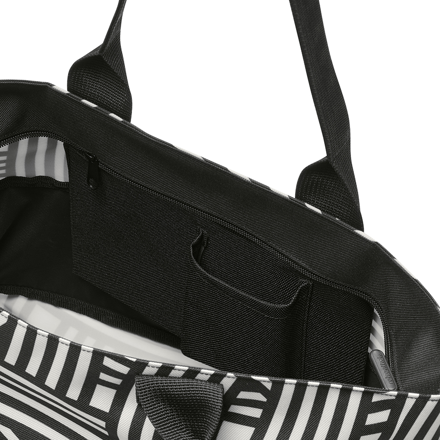 В центре - специальная молния, расстегнув которую вы увеличиваете вместимость (,в обычном состоянии - 12 литров, в разложенном - 18 литров),. Внутри сумки карман на молнии для мелочей. Две ручки позволяют удобно повесить её на плечо. Материал – прочный водоотталкивающий полиэстер.