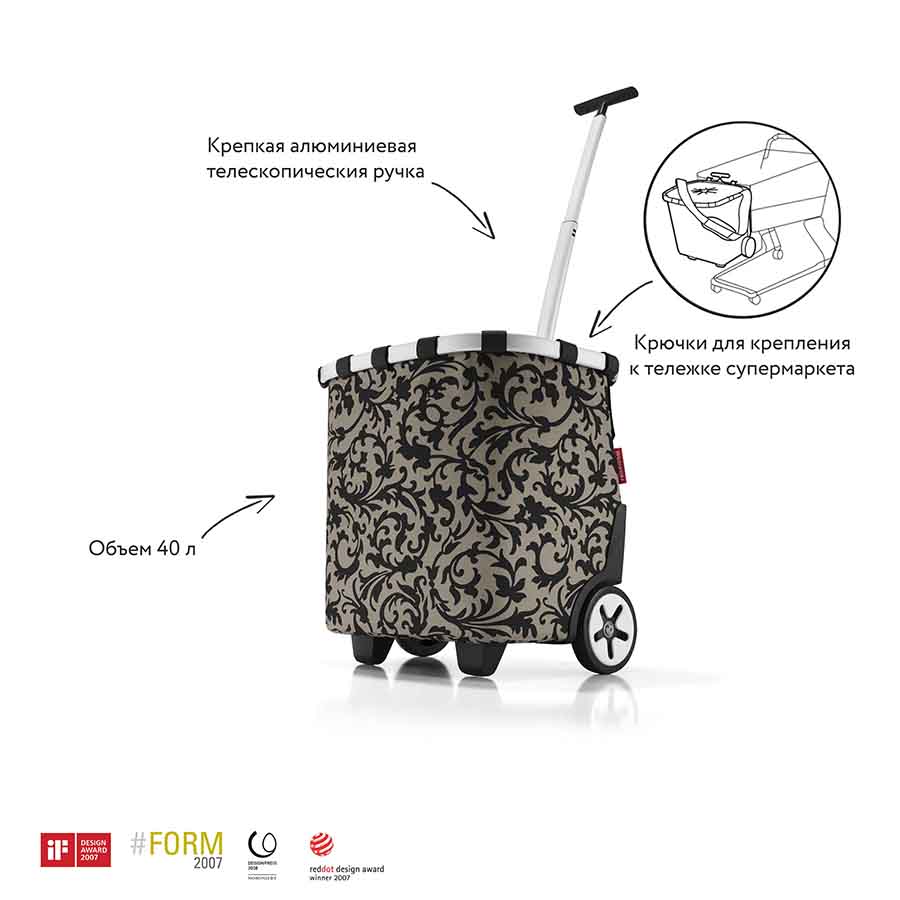 Прочная и стабильная алюминиевая рама устойчива к механическому воздействию. Съемный внутренний мешочек снимается для стирки. Удобная телескопическая ручка и широкий ремень с регулируемой длиной обеспечивают комфортную транспортировку. Сумка легко крепится к корзине-тележке в супермаркете и запросто помещается в багажник автомобиля. Высококачественный водоотталкивающий полиэстер легко чистится и прекрасно выглядит. Объем – 40 литров. Максимальная нагрузка – 20 кг.