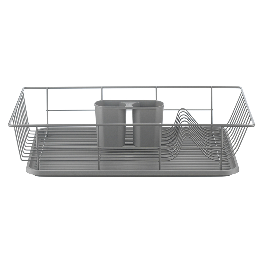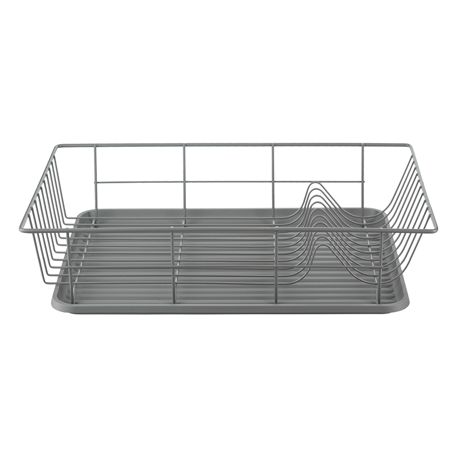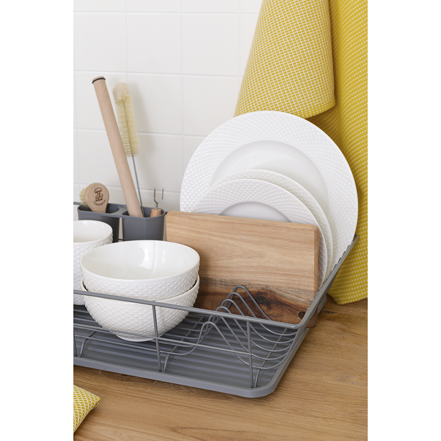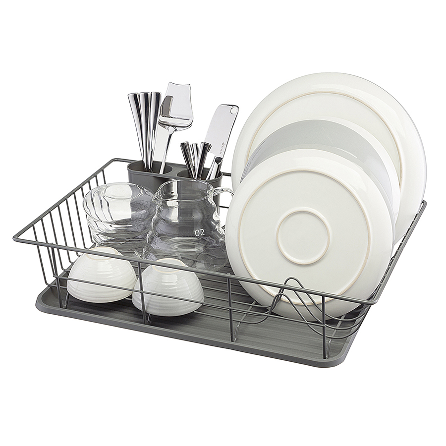Сушилка Hoem представляет собой эргономичную конструкцию с отделениями для посуды и кухонных принадлежностей. Каркас имеет вид железной сетки со специальными изгибами, позволяющими удобно разместить тарелки и другие емкости. Поддон для воды выполнен из практичного пластика, который легко очищается от загрязнений. Предусмотрены специальные съемные контейнеры для столовых приборов.