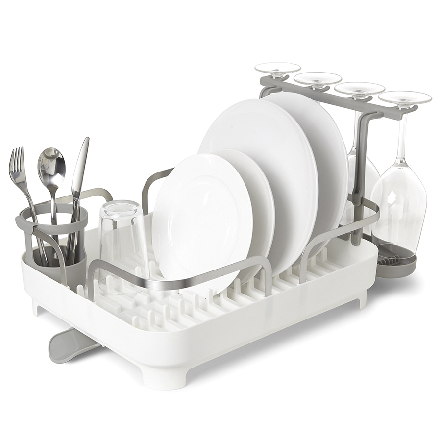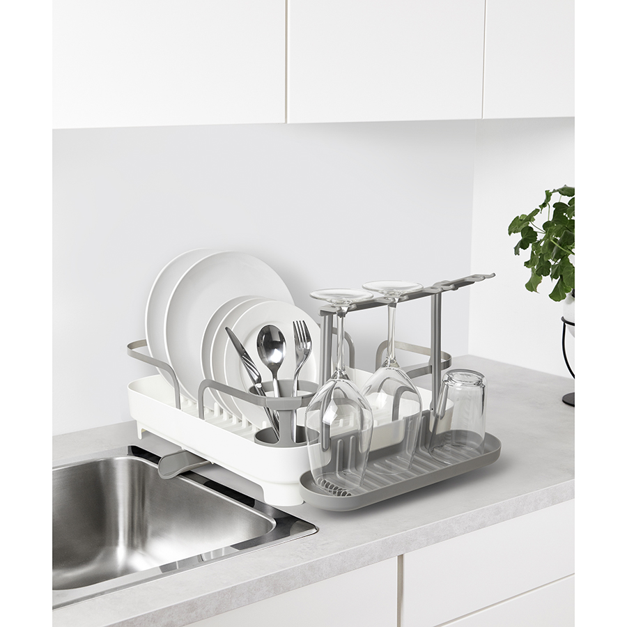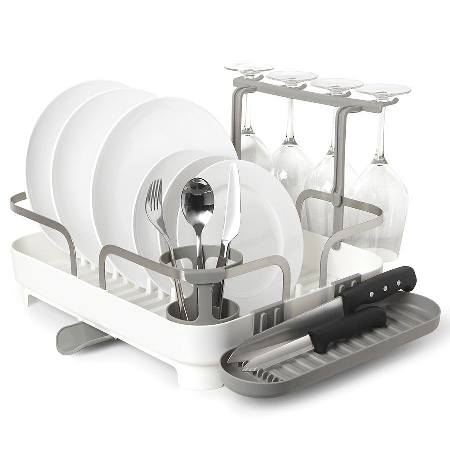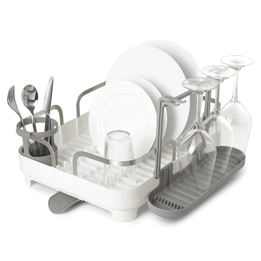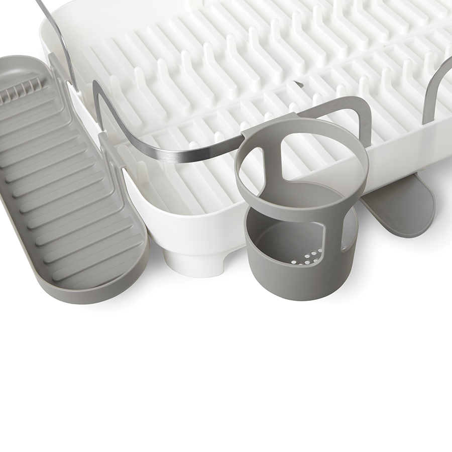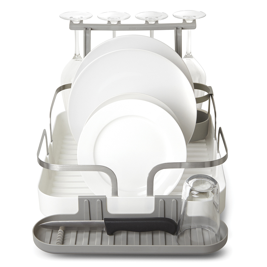 Сушилка включает стальную раму и пластиковый поддон и несколько съемных частей, которые можно конфигурировать так, как удобно: стакан для сушки столовых приборов, рама для сушки винных бокалов и узкий боковой отсек c делениями для сушки ножей. Решетка поддона рассчитана на 15 тарелок. Предусмотрен слив, который не даст воде застаиваться.