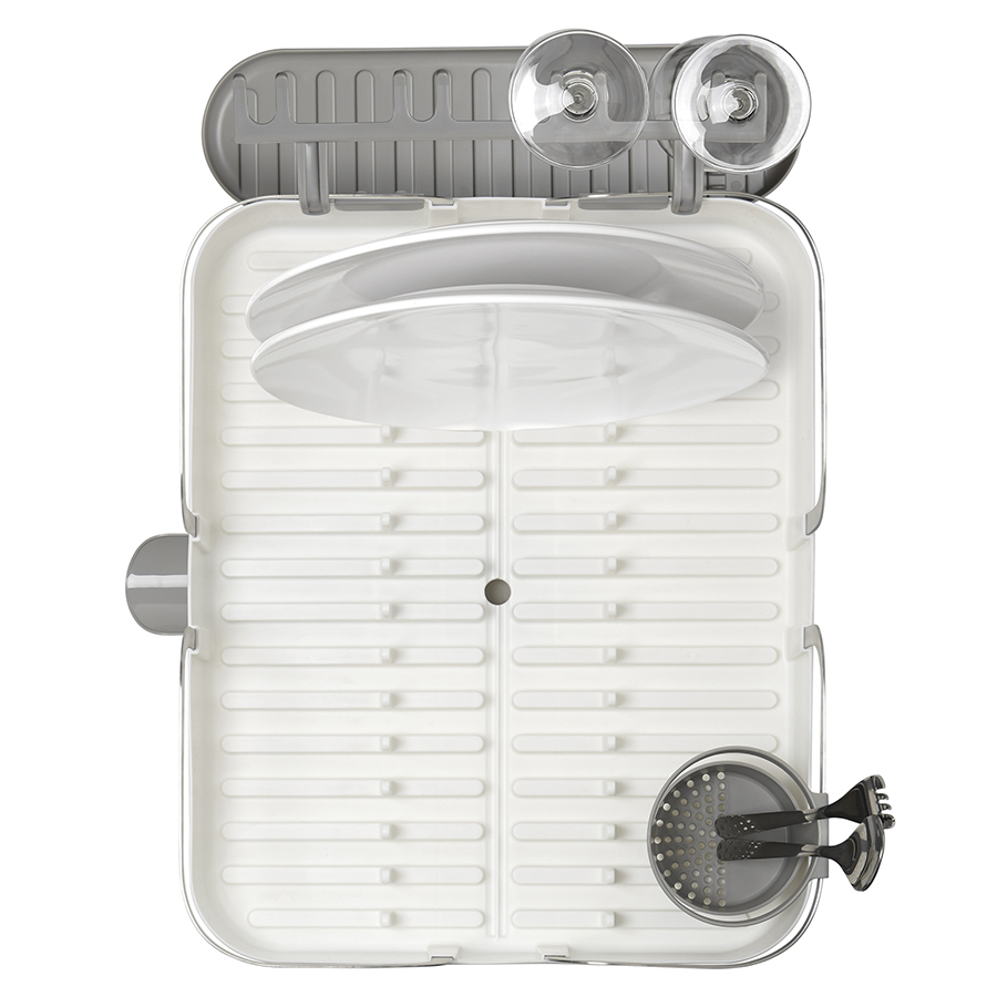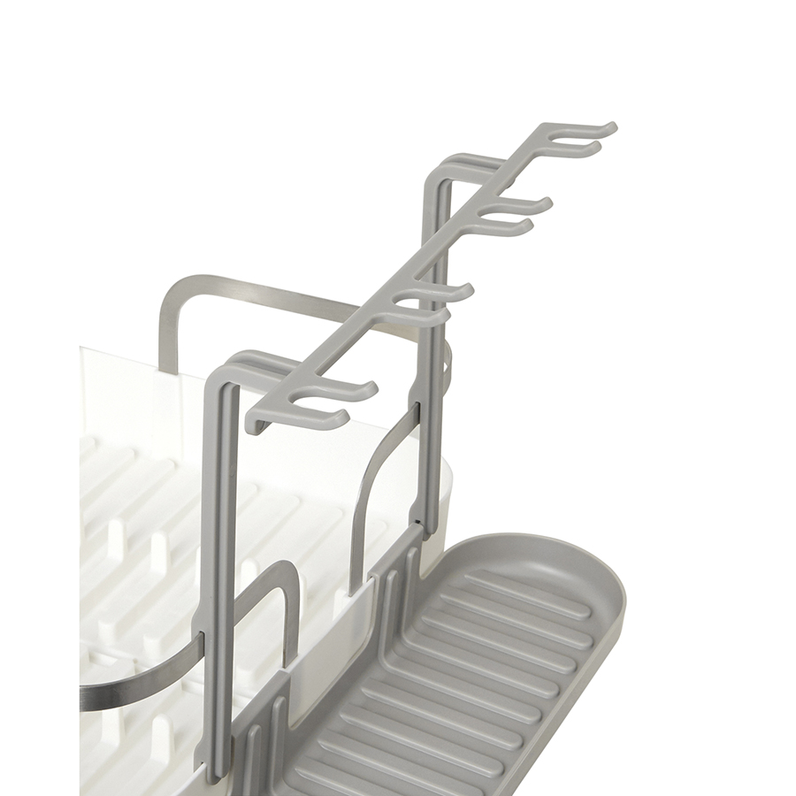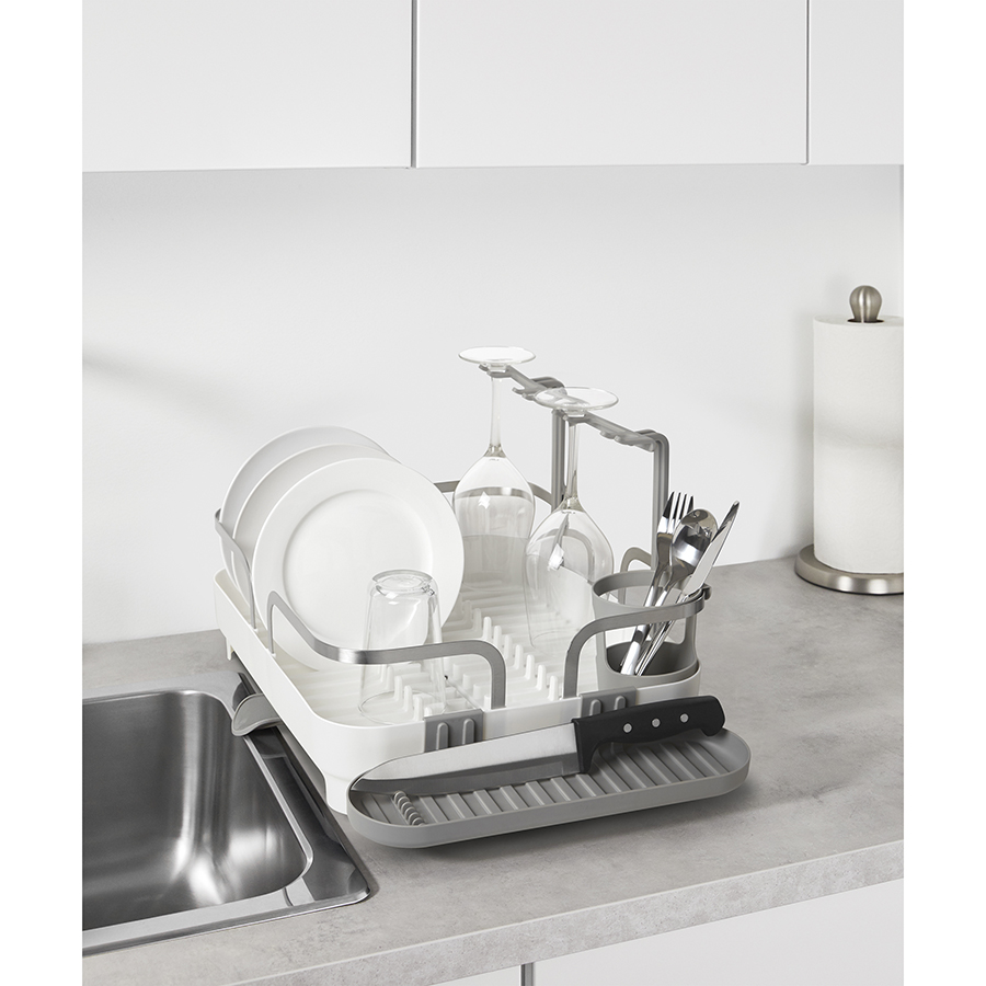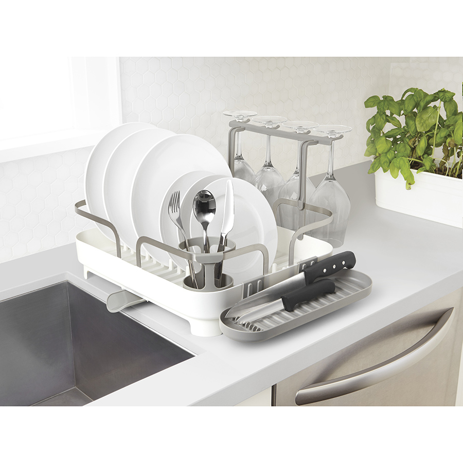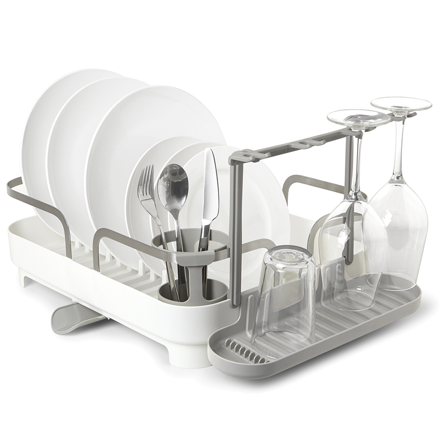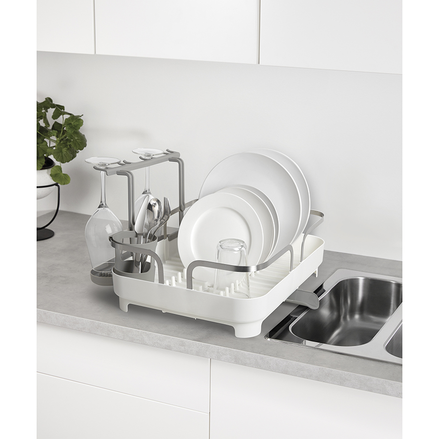 Сушилка включает стальную раму и пластиковый поддон и несколько съемных частей, которые можно конфигурировать так, как удобно: стакан для сушки столовых приборов, рама для сушки винных бокалов и узкий боковой отсек c делениями для сушки ножей. Решетка поддона рассчитана на 15 тарелок. Предусмотрен слив, который не даст воде застаиваться.