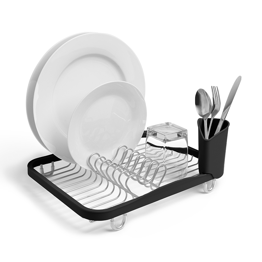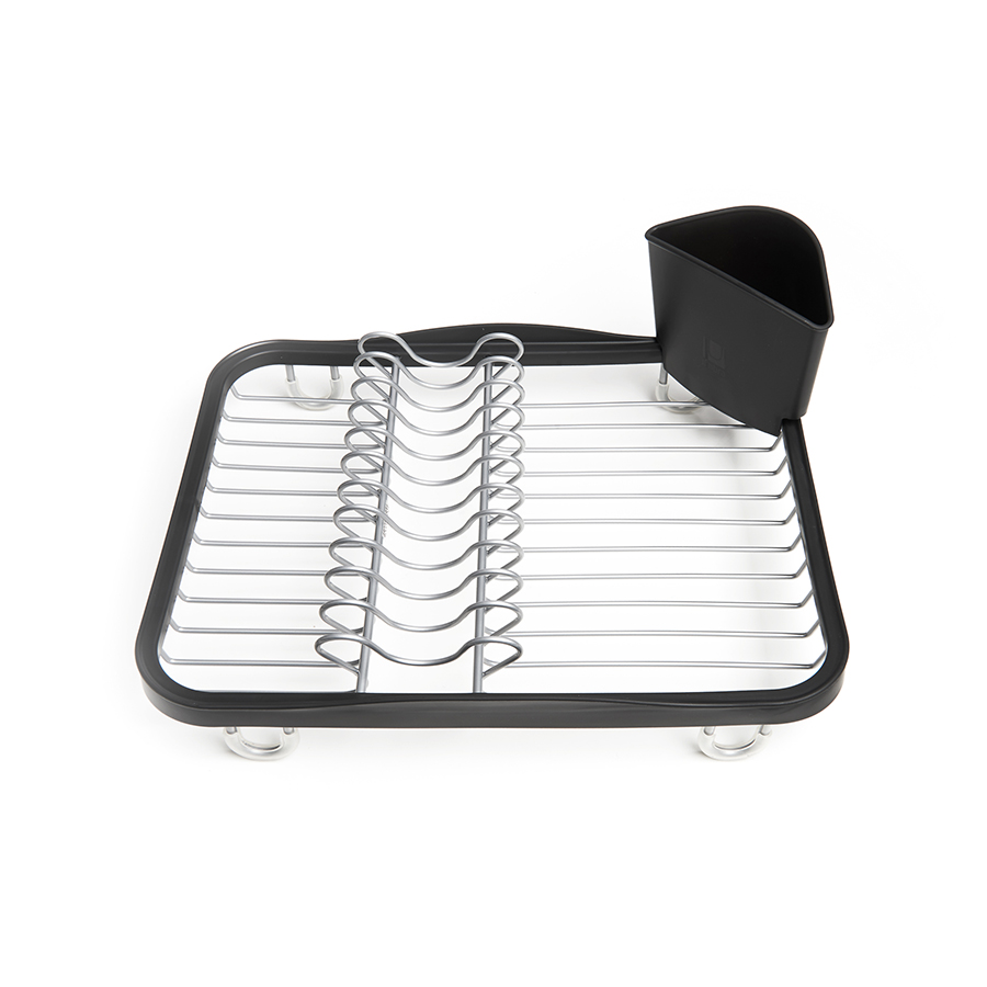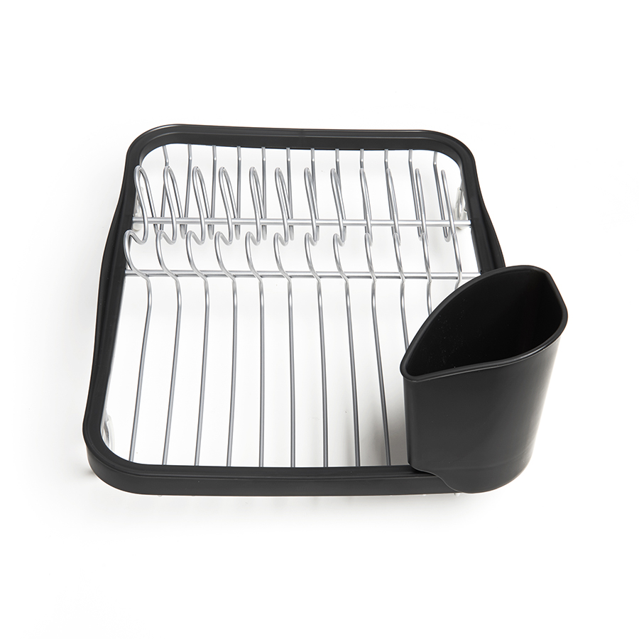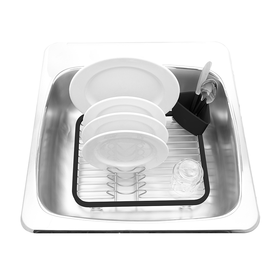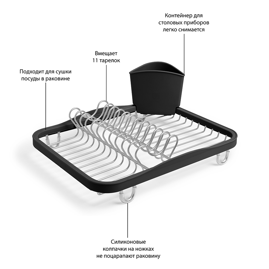 Предусмотрены отсеки для тарелок и чашек. Съемный пластиковый контейнер удобен для сушки столовых приборов. Благодаря специальным ножкам вода стекает в раковину, не застаиваясь под посудой. Пластиковые насадки на ножках оберегают раковину от царапин. , ,Металлическая решетка и пластиковое обрамление легко очищаются от загрязнений.