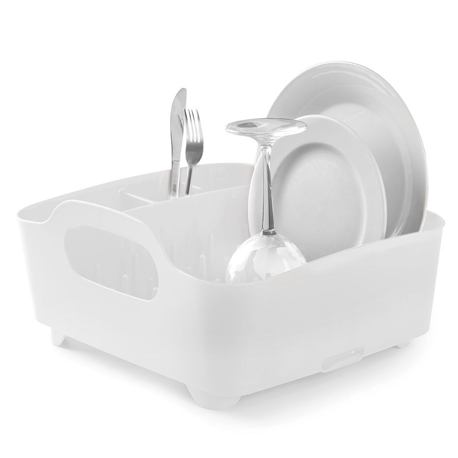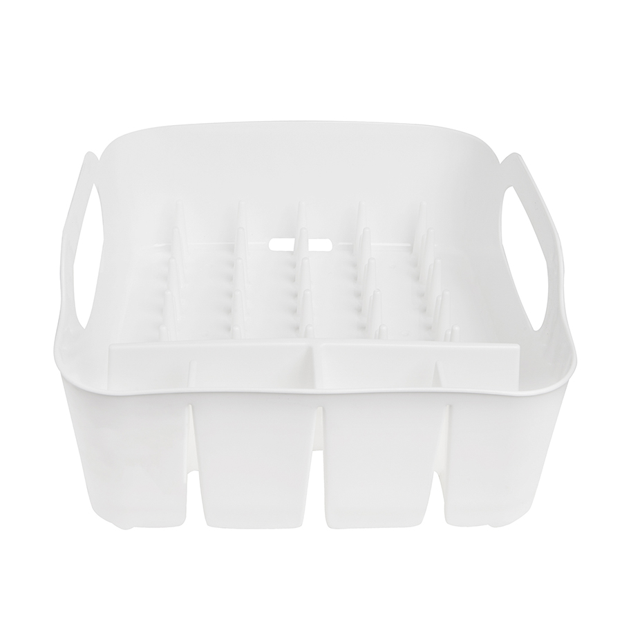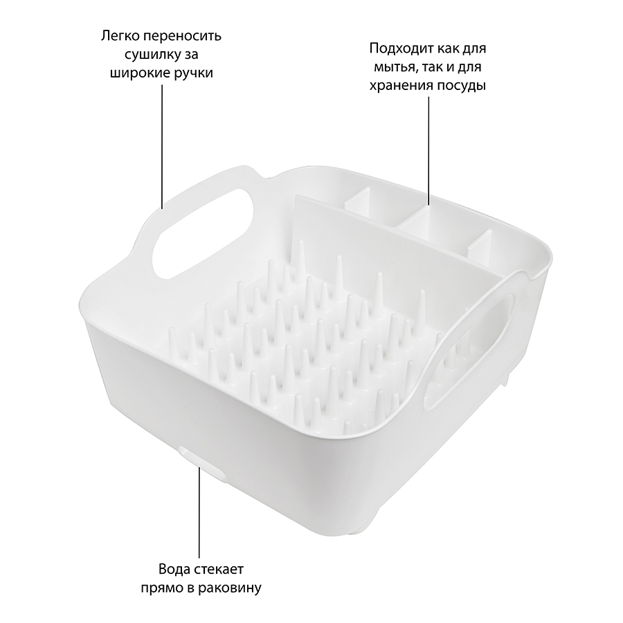 Мобильная сушилка для посуды состоит из пяти отделений: широкого — для сушки тарелок, чашек и сотейников и четыре маленьких для столовых приборов и аксессуаров. Выступы разной высоты на дне , ,сушилки позволяют аккуратно расставить посуду. Благодаря ножкам и отверстию для слива, вода не будет , ,застаиваться, что предотвратит появление неприятного запаха.