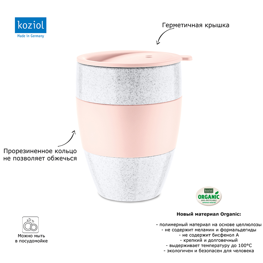 Термокружка Aroma To Go 2.0 позволит вам в любую удобную минуту насладиться горячим кофе. Конструкция модели разработана таким образом, что напиток внутри сохраняет температуру максимально долгое время. Прорезиненное кольцо снаружи не позволяет обжечься, а крышка с дозатором плотно сидит на горлышке, поэтому вы ни капли жидкости не прольете на себя. Кружка изготовлена из органического материала на основе целлюлозы – экологически чистого, нетоксичного, не содержащего формальдегида и бисфенола А.