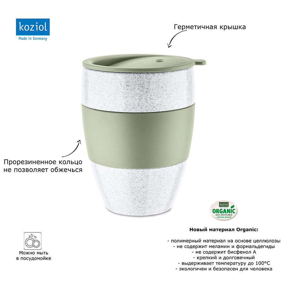 Термокружка Aroma To Go 2.0 позволит вам в любую удобную минуту насладиться горячим кофе. Конструкция модели разработана таким образом, что напиток внутри сохраняет температуру максимально долгое время. Прорезиненное кольцо снаружи не позволяет обжечься, а крышка с дозатором плотно сидит на горлышке, поэтому вы ни капли жидкости не прольете на себя. Кружка изготовлена из органического материала на основе целлюлозы – экологически чистого, нетоксичного, не содержащего формальдегида и бисфенола А.