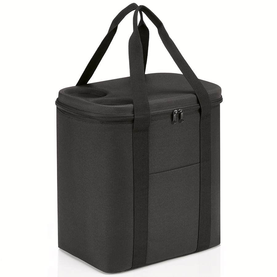 На крышке расположены удобные выемки для напитков. Внутри – термоизоляционный материал, который сохранит продукты в прохладе. Крышка закрывается очень плотно и застегивается на молнию. Тепловая изоляция выполнена из высококачественной алюминиевой фольги. Сумка оборудована удобными ручками для переноски. Материал – прочный водоотталкивающий полиэстер, выполненный из переработанного пластика PET. Объем – 30 л.