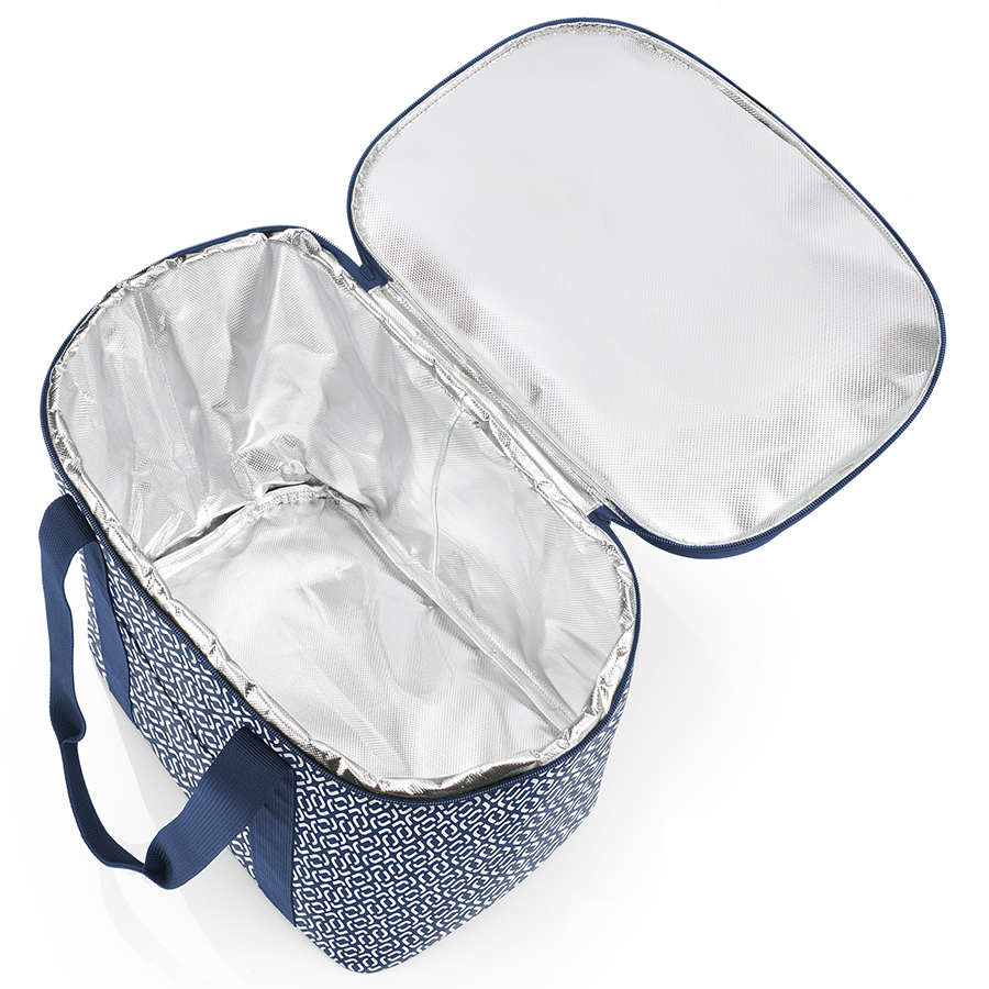 На крышке расположены удобные выемки для напитков. Внутри – термоизоляционный материал, который сохранит продукты в прохладе. Крышка закрывается очень плотно и застегивается на молнию. Тепловая изоляция выполнена из высококачественной алюминиевой фольги. Сумка оборудована удобными ручками для переноски. Материал – прочный водоотталкивающий полиэстер, выполненный из переработанного пластика PET. Объем – 30 л.