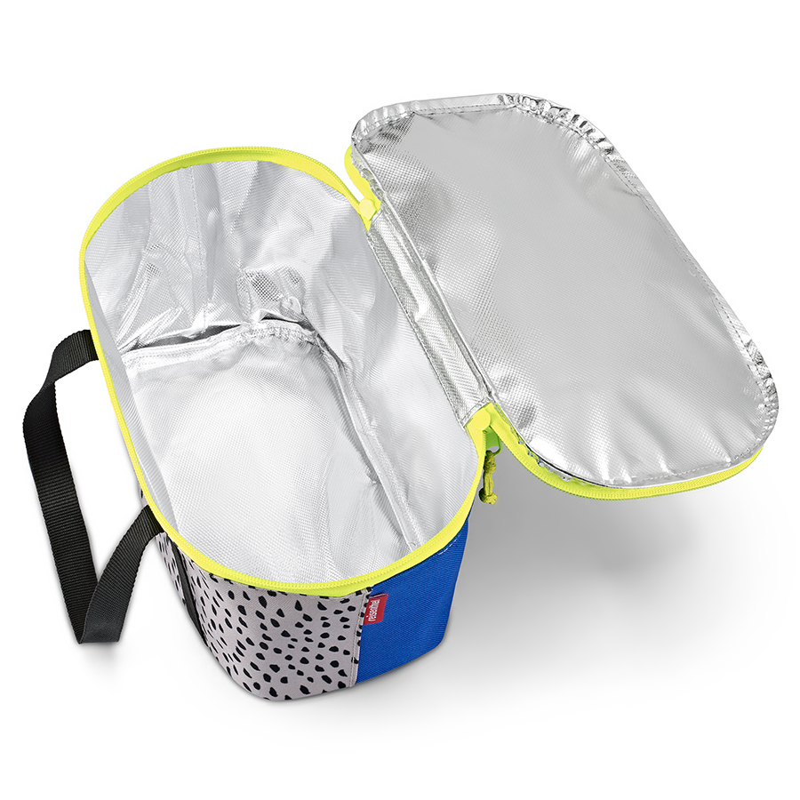 Внутри - термоизоляционный материал, который сохранит продукты в прохладе. Крышка закрывается очень плотно и застегивается на молнию. Тепловая изоляция выполнена из высококачественной алюминиевой фольги. Сумка оборудована удобными ручками для переноски. Материал – прочный водоотталкивающий полиэстер, выполненный из переработанных пластиковых бутылок. Объем – 4 л.
