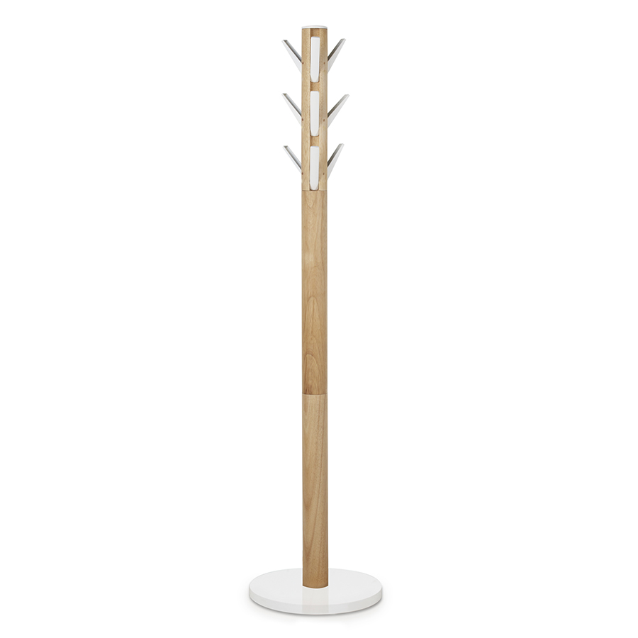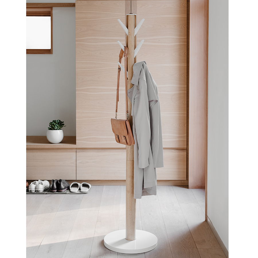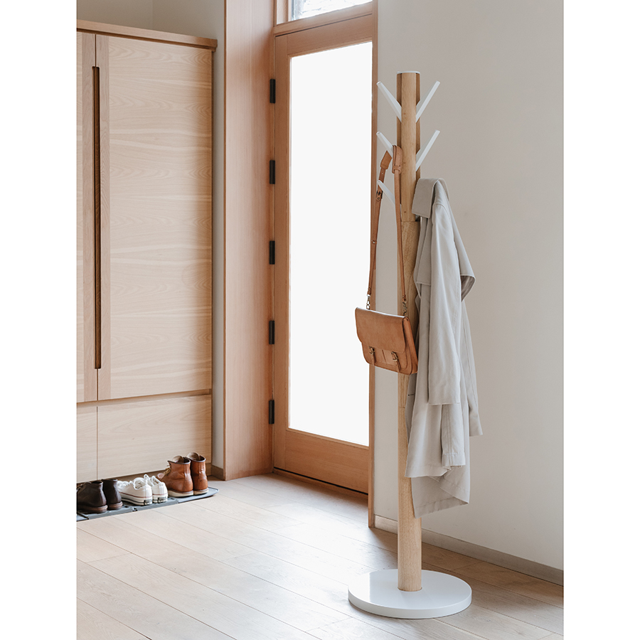 Напольная вешалка с основанием из натурального дерева поможет организовать дополнительное пространство для хранения верхней одежды и прекрасно в пишется в современный интерьер.