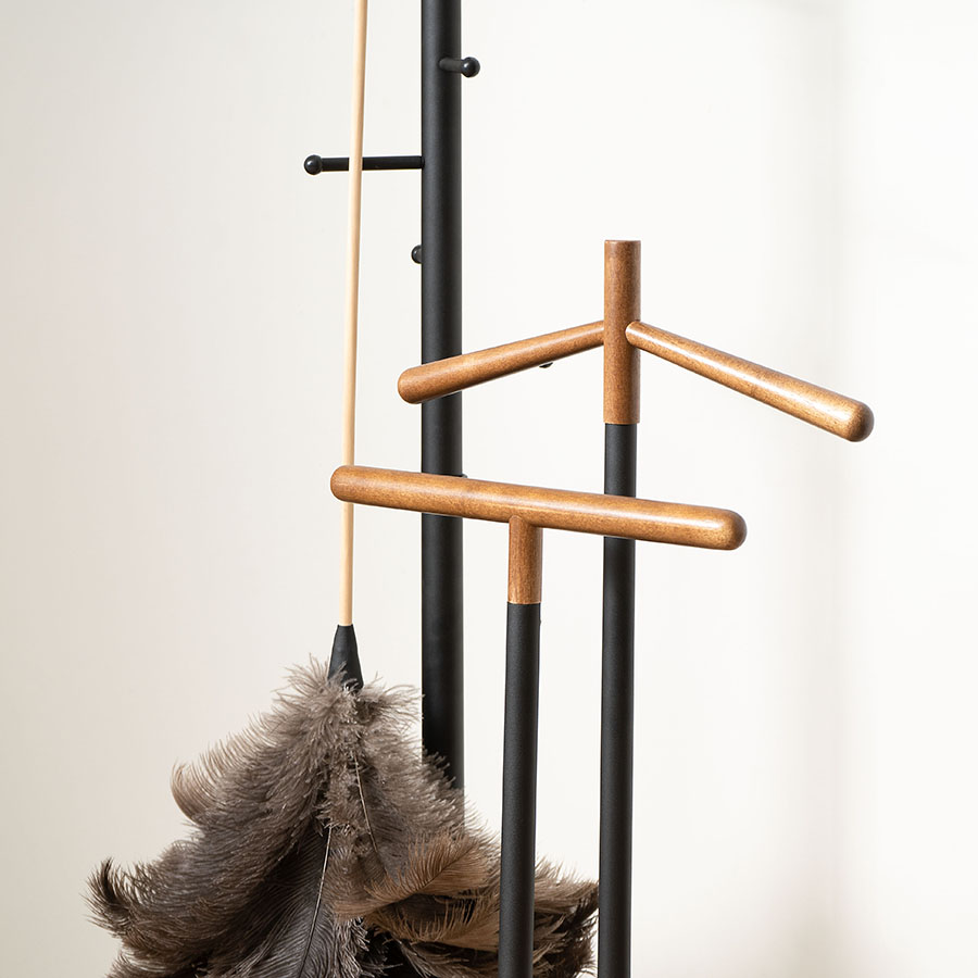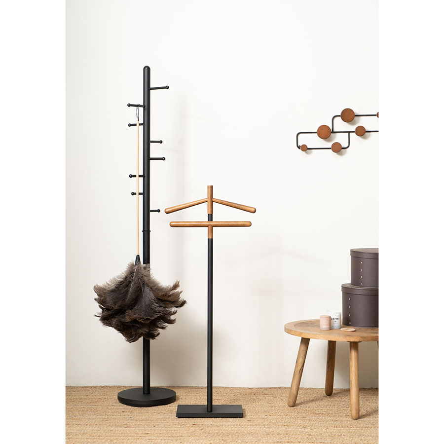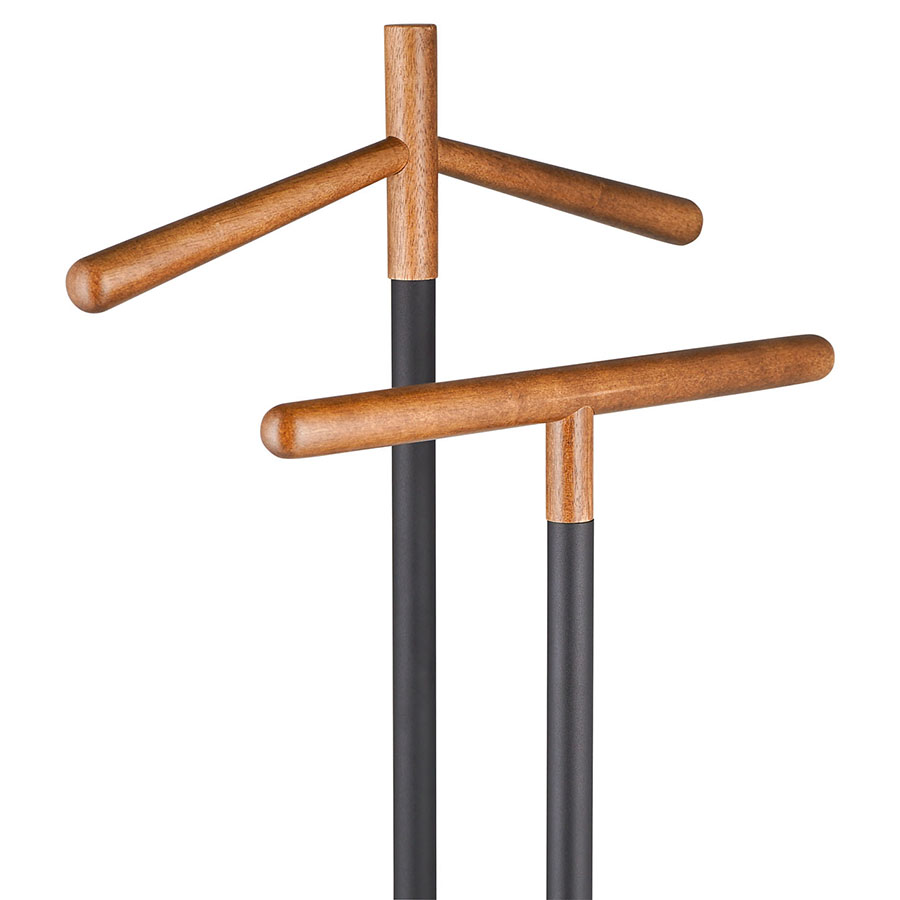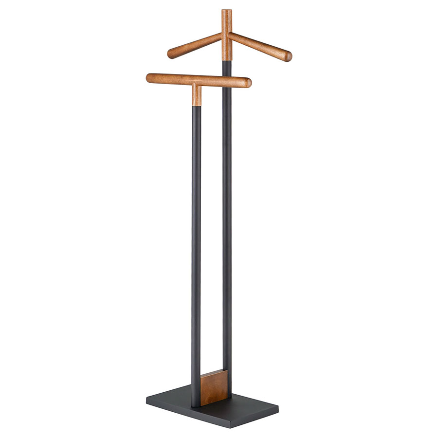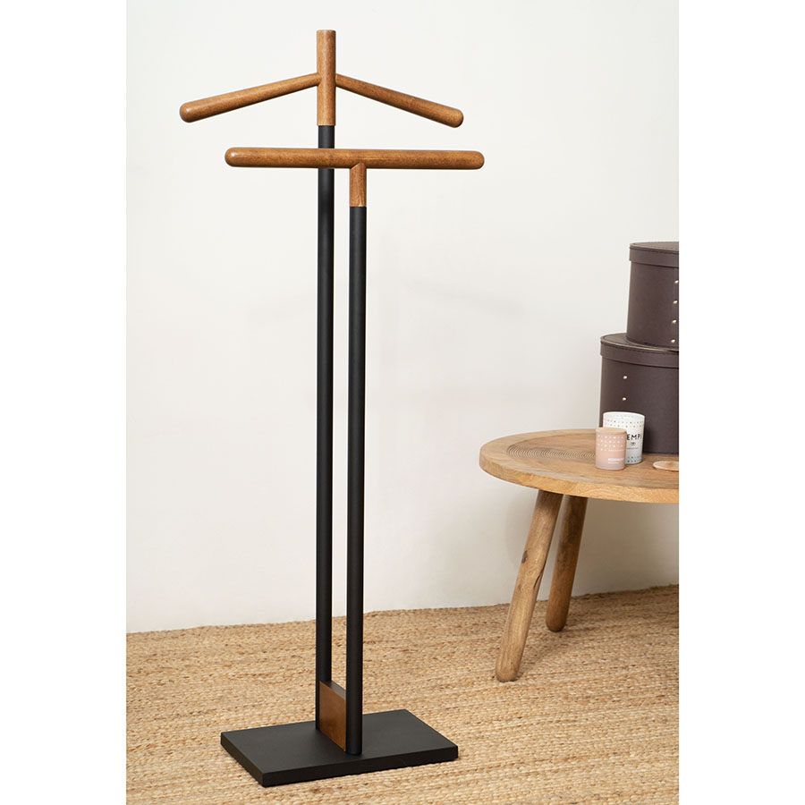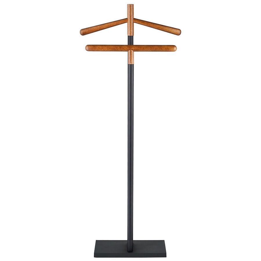 Вешалка Laficara – идеальное место для хранения костюмной пары: брюк и пиджака. Две вертикальные стойки с плечиками выполнены из стали и дерева. Прочная конструкция не занимает много места и идеально вписывается в небольшую спальню или рабочий кабинет. Прямоугольное металлическое основание обеспечивает хорошую устойчивость и не дает вешалке опрокинуться от случайного толчка.
