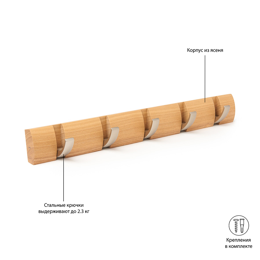 Вешалка имеет 5 откидных крючков из никеля: когда они не используются, их можно легко сложить. Каждый крючок выдерживает вес до 2,3 кг. Поставляется с подробной инструкцией по установке и необходимым монтажным оборудованием.
