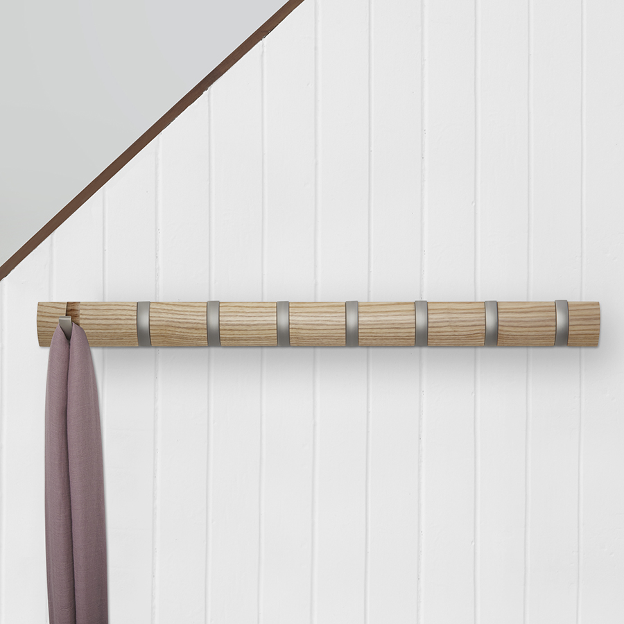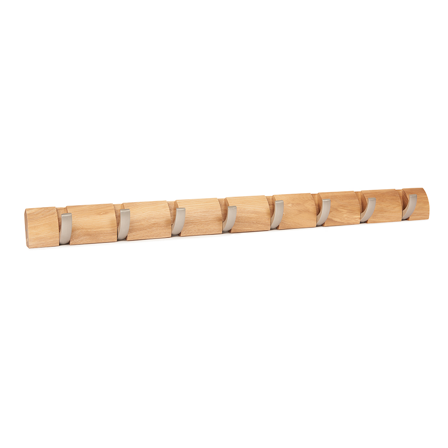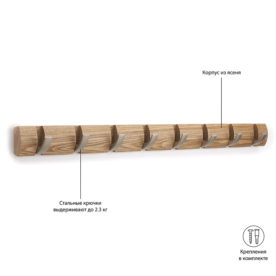 Вешалка имеет 8 откидных крючков из никеля: когда они не используются, их можно легко сложить. Каждый крючок выдерживает вес до 2,3 кг. Поставляется с подробной инструкцией по установке и необходимым монтажным оборудованием.