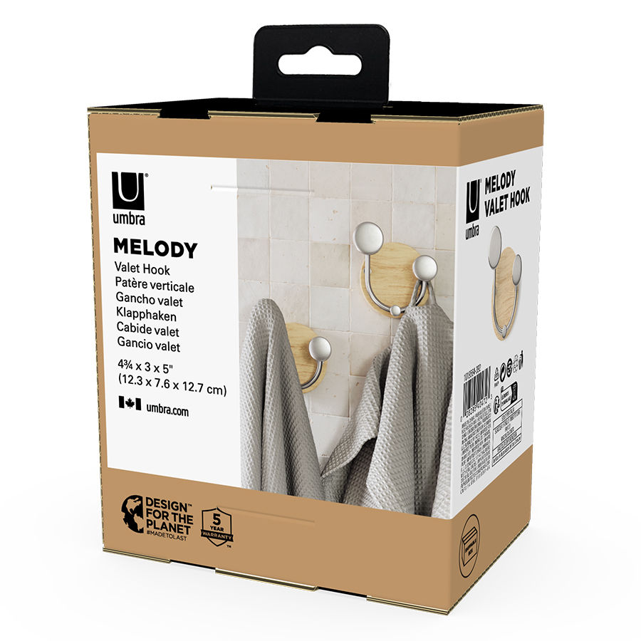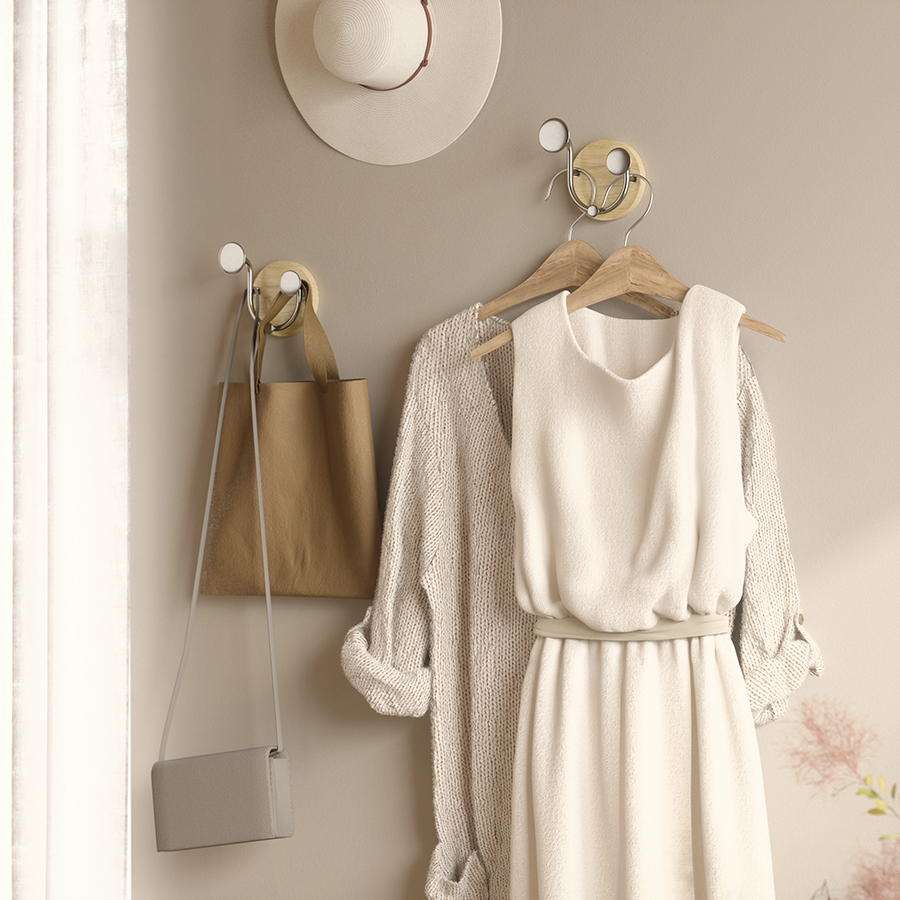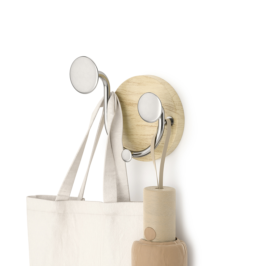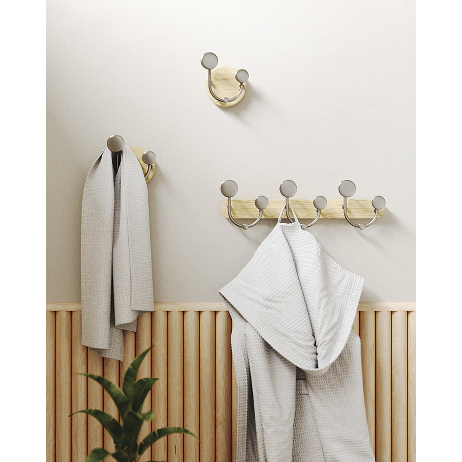 Вешалка настенная Melody идеально подойдет для компактного хранения вещей в любой из комнат и станет стильным акцентом интерьера. Сочетание дерева и элементов из металла придает аксессуару современный, но в то же время естественный вид. Вешалка оснащена тремя крючками, на которых можно удобно размещать предметы одежды, головные уборы, шарфы, сумки и другие аксессуары.