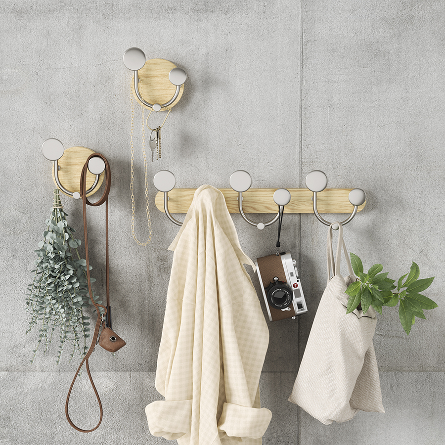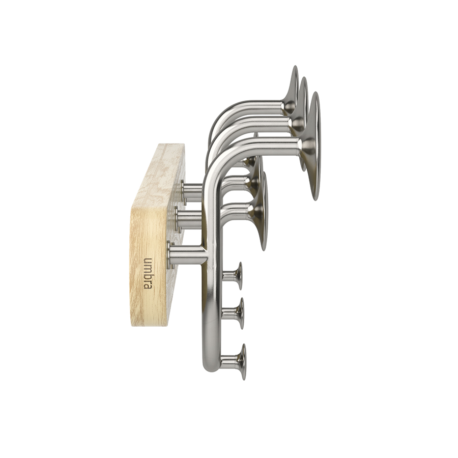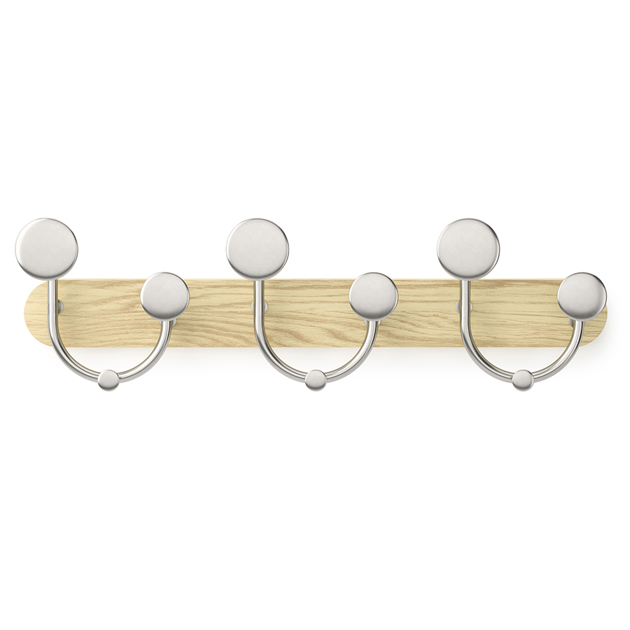 Материалы: алюминий, каучуковое дерево, ясень. Размеры: 43х8х13 см. Максимальная нагрузка на 1 крючок: 2,3 кг. Цвет: натуральное дерево/никель.