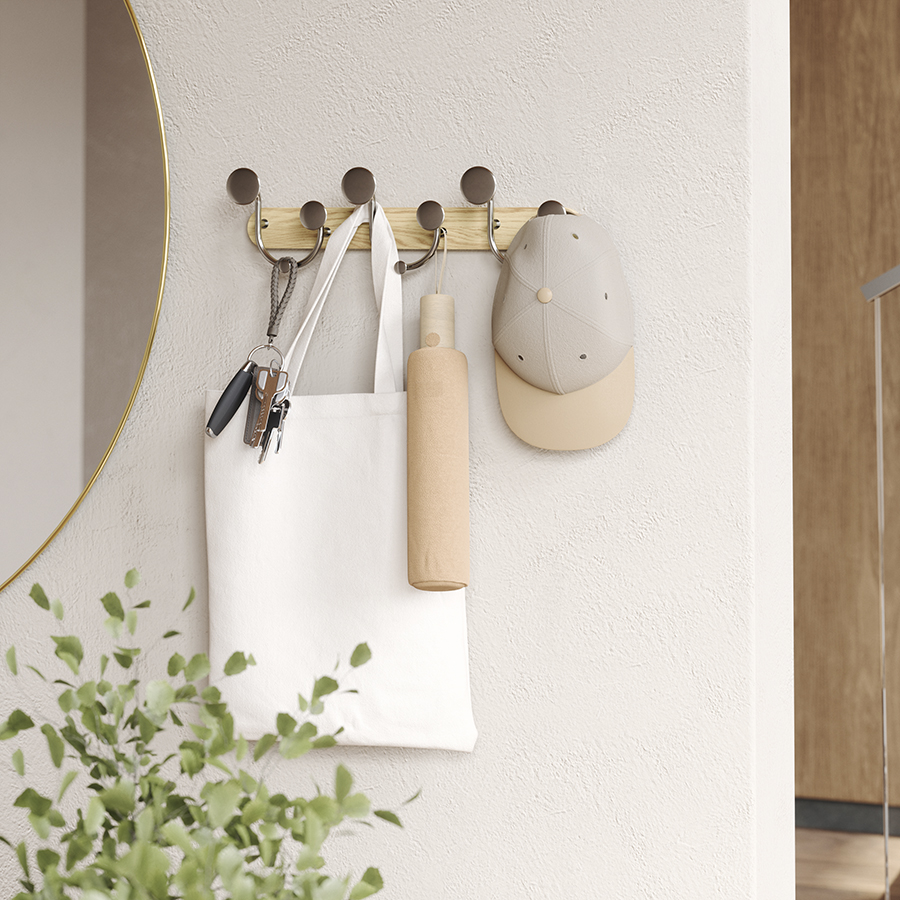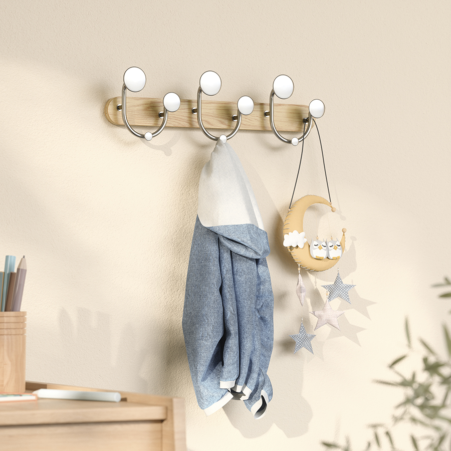Вешалка настенная Melody идеально подойдет для компактного хранения вещей в любой комнате и станет стильным акцентом интерьера. Сочетание дерева и элементов из металла придает аксессуару современный, но в то же время естественный вид. Вешалка оснащена девятью крючками, на которых можно удобно размещать предметы одежды, головные уборы, шарфы, сумки и другие аксессуары.